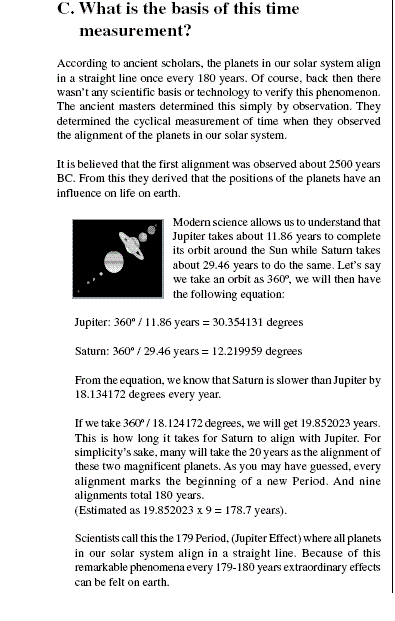 Nhắc lại là trong các hiện tượng alignment xảy ra kể như thường kỳ với các tọa độ khác nhau, lúc nào cũng có sự góp mặt của Kim, Mộc, Thủy, Hỏa, Thổ là dĩ nhiên, lư do nào mà lại chọn cái thường kỳ 178,7 năm (180 năm cho gọn?) ? Hay là v́ để cho tính đủ Can Chi 60 năm?