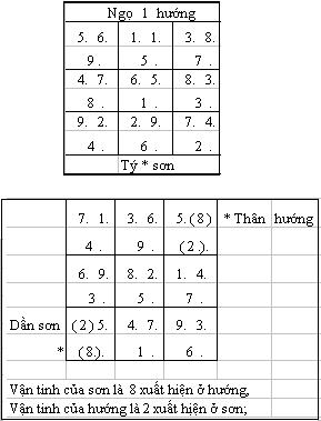 - Vận 2, 5, 8 là cung Khôn, cung Cấn; vận 3, 7 là cung Chấn, cung Đoài; vận 4, 6 là cung Tốn, cung Kiền; vận 1, 9 là cung Khảm, cung Ly...."