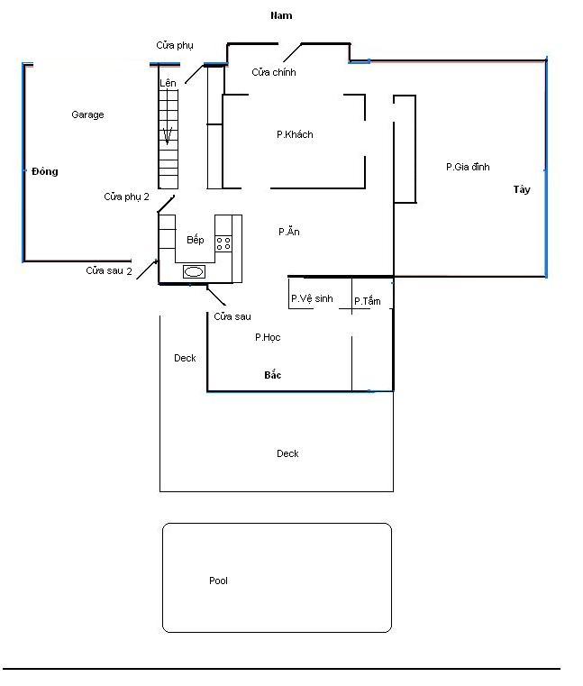 Tôi chỉ hiểu được những điểm căn bản của HKPT, nên muốn nghiên cứu thêm để có cơ hội giúp những người quen khi họ nhờ xem giúp phong thủy, nhưng bây giờ mới biết là c̣n quá nhiều lư thuyết cần phải học thêm. Tôi thấy rất may mắn là được bác và một số người ở đây có khả năng và tận t́nh giúp đỡ. Tuy có nhiều lư thuyết bác đă hướng dẫn từ trước đến giờ, nhưng vẫn c̣n nhiều điều chưa có cơ hội được bác đưa ra. Nên hôm nay tôi mạo mụi đăng sơ đồ căn nhà để có dịp học thêm những cái mới từ bác và mọi người. Hy vọng tôi và những người khác sẻ có cơ hội t́m hiểu thêm môn HKPT.