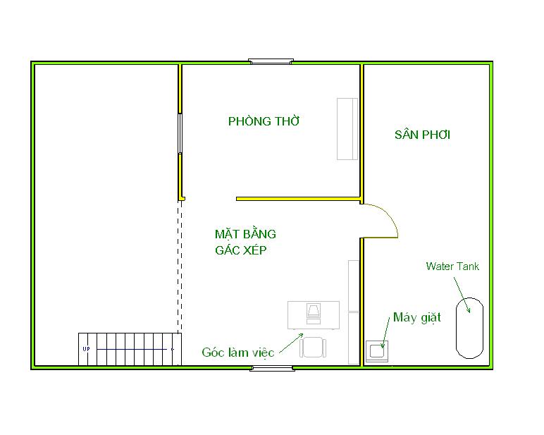 Vừa rồi cháu có ư định muốn thêm một tầng xép để thêm diện tích sử dụng cho căn nhà và dưới đây là sơ đồ cháu phác thảo qua và các đồ đạc trong nhà để hai bác coi giúp cháu có ǵ sai sót xin các bác chỉ bảo: