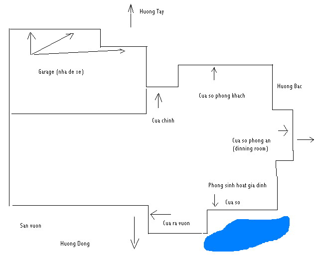 Nhà anh của em quy về hướng chánh Tây (cửa chính quy về hướng Tây luôn), garage cũng quay mặt về hướng Tây. Thiệt t́nh em không hiểu tọa ở hướng Tây hay quay về hướng Tây khác nhau như thế nào. Nhân tiện đây em có post sơ đồ nhà anh của em để xin được hướng dẫn cho anh của em.
