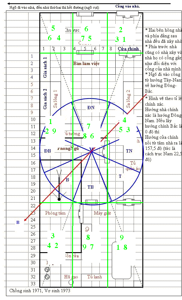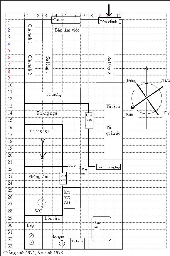 Theo sơ đồ mới, cửa chính là cửa cổng th́ tâm nhà thay đổi theo h́nh vẽ mới tôi đă sửa lại và anh đă xem, do đó hướng cửa pḥng ngủ là hướng Tây-Nam. Vậy cửa pḥng ngủ không phải là hướng Nam, do đó không có Tuyệt mệnh.  Phải chăng anh tính hướng của cửa pḥng ngủ tính theo tâm của pḥng (tiểu thái cực) Vậy anh xem lại giúp tôi nhé. (À phần Phi Tinh anh đă nghiên cứu sắp xong chưa? )