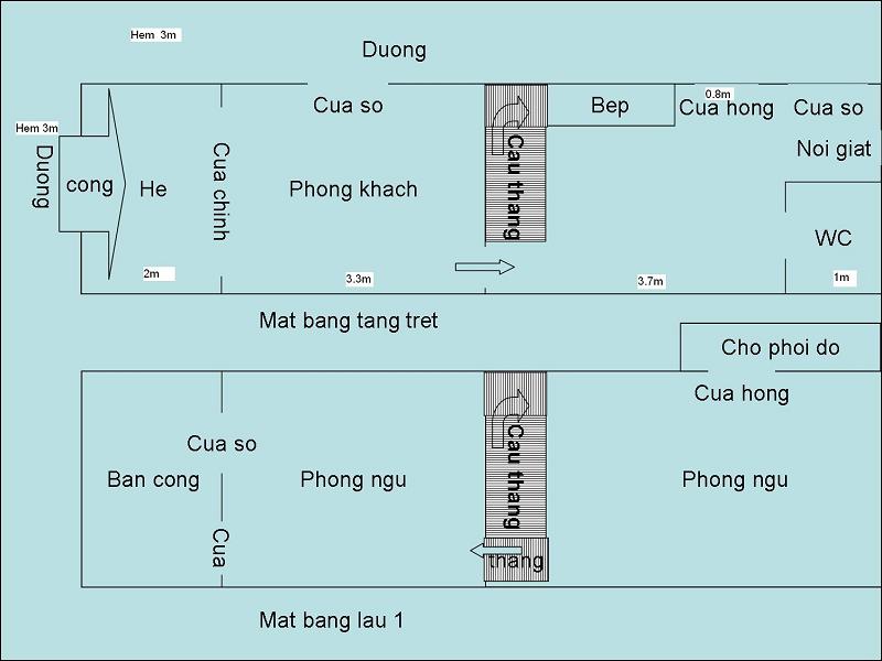 Em tuổi Bính Th́n, cách đây 4 năm em có sửa lại căn nhà mà em mua năm 2002 (nhà 3m x 10m, 1 trệt 1 lầu, hướng Tây Nam 242 độ). Từ ngày sửa nhà, chỉ có việc học là hanh thông, c̣n chuyện tiền bạc th́ hư không, cuộc sống luôn luôn túng thiếu, nợ như Chúa Chổm, thật vất vả trăm bề. Thấy các bác kiến thức sâu rộng, em mạn phép đưa sơ đồ căn nhà mong được nghe các bác chỉ giáo em cần sửa chữa những ǵ để giúp cải thiện t́nh h́nh hiện tại.