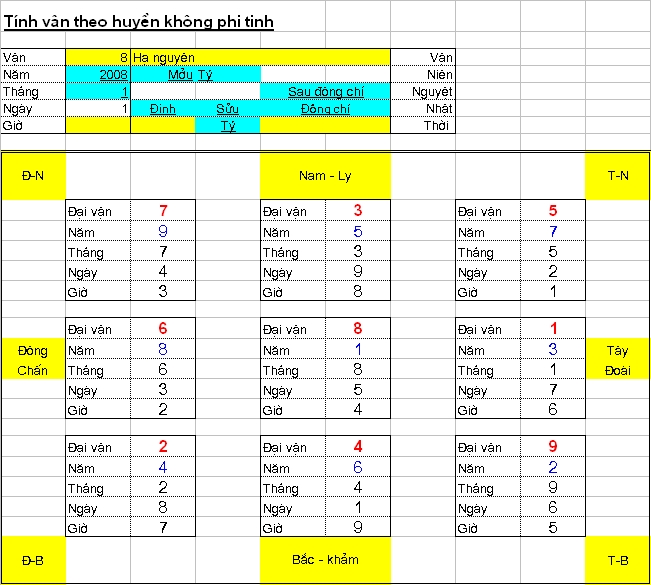 Trở lại vấn đề trên, cách tính niên, nhật, thời vận đă có công thức rồi, bác cứ tra cuốn sách nào đó về Huyền không sẽ có. VD về nguyệt vận: