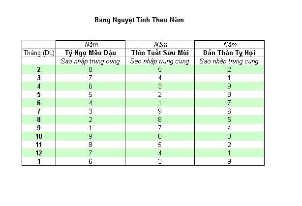 Cám ơn bác Lái Thuyền đă tham gia vào trận phi tinh tùm lum này, nhưng cho omely hỏi cái bảng phía trên. Nguyệt tinh theo năm như trên mà ghi theo dương lịch th́ cũng hơi ngộ!