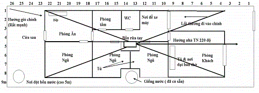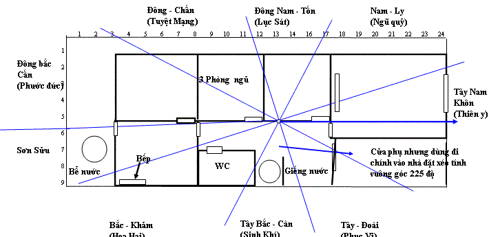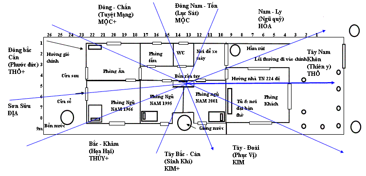 Nếu nhà đă đổi hướng về 224 độ, lại thêm có cửa sau và bể chứa nước ở đó th́ không c̣n lo ngại ǵ nữa. Nhà bạn đă đắc Tam ban quái, nên mọi phương diện tiền bạc, gia đ́nh hạnh phúc, con cái ngoan, hiền, thành đạt đều có đủ. Tuy đúng ra cửa sau nên làm tại cung Sửu, nhưng nếu bất đắc dĩ không làm được, nhưng mở cửa sổ th́ cũng tạm được. Bếp th́ nên dời hẳn sang phía ĐÔNG, chứ đừng để ở ĐÔNG BẮC kẻo có hại hoặc làm suy giảm nhân đinh. Hướng bếp nh́n về phía TÂY BẮC th́ con tuy giỏi nhưng hơi cứng đầu, hay căi cha, mẹ. Bồn rửa tay giữa nhà sẽ giúp cho cậu con trai sinh năm 2001 học hành rất giỏi, thông minh. C̣n cậu con trai sinh năm 1995 cũng nhờ nó mà được mạnh khoẻ, học hành khá và sớm thành đạt. Tuy nhiên, ngay trước cửa nhà bạn có hầm chứa nước từ nhà vệ sinh chủ ô uế, mà v́ phía trước nhà bạn bị hướng tinh Nhị hắc chiếu tới, lại gặp hầm chứa nước này nên chỉ sợ trong nhà bạn dễ phát sinh bệnh dịch. Cách tốt nhất là dời hầm này ra khu vực phía trước pḥng khách, c̣n nếu không th́ phải lo giữ ǵn khu vực phía trên hầm cho thật sạch sẽ mới được. Nhưng vẫn lo ngại mỗi khi hầm đươc hút lên là có động khí đem bệnh tật tới, v́ hầm nằm ngay lối đi và cửa ra vào quá.