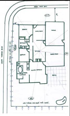 Nhà cháu 1 story , nhà này được xây 1971 , c̣n gia đ́nh cháu dọn và đây năm 2005.Nhà cháu ỡ ngay corner , từ trong nhà nh́n ra đường th́ bên tay trái là con đường đại lộ- có hàng thông cao bằng mái nhà- bên tay phăi là nhà hàng xóm (cũng 1 story ), phía sau nhà cũng nhà hàng xóm với một hàng thông chóp nhọn cao quá nhà cháu. C̣n trước mặt nhà cháu khoăng 3 block đường xa xa chếch về hướng nam là một dăy đồi cao. Thế đất cũa nhà cháu th́ bằng phẵng. C̣n sau vườn nhà cháu hướng tây bắc có ḥn non bộ có hồ nhơ với thác nước và tượng Phật Quan Âm cao đướng trên đĩnh ḥn non bộ.Chồng cháu sinh năm 1973 , c̣n cháu sanh năm 1974.Cháu đứng giữa trung tâm nhà đo th́ cữa chánh cũa nhà cháu khơang 167 -169 độ.